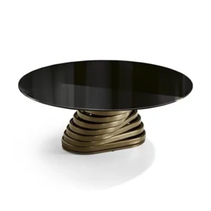 The Rotolo low coffee table with a glass top by Eforma combines modern design with a luxurious touch. The clear glass surface contrasts beautifully with the sculptural base, creating a light yet elegant look. Customisation options available. Visit the showroom for more details.